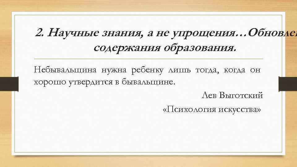 2. Научные знания, а не упрощения…Обновлен содержания образования. Небывальщина нужна ребенку лишь тогда, когда он хорошо утвердится в бывальщине. Лев Выготский «Психология искусства»