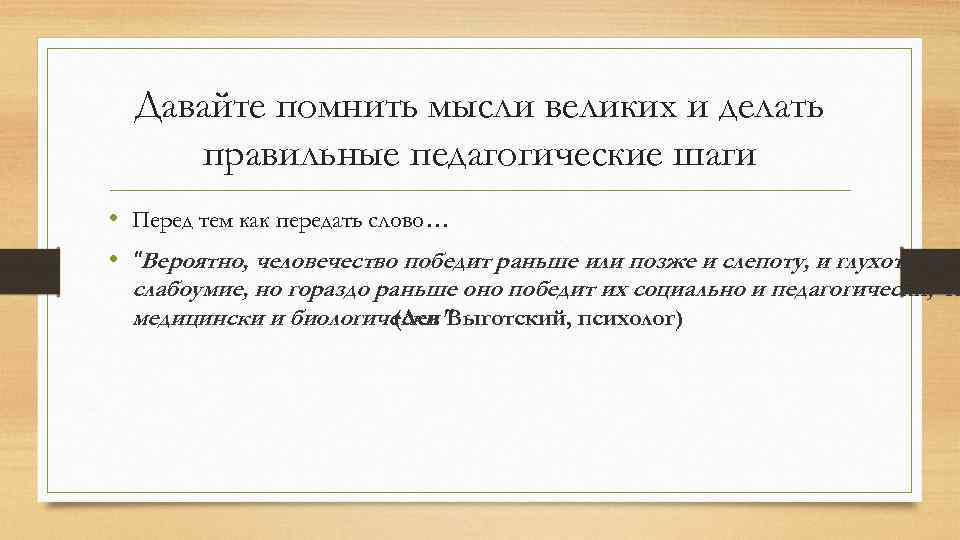 Давайте помнить мысли великих и делать правильные педагогические шаги • Перед тем как передать слово… • "Вероятно, человечество победит раньше или позже и слепоту, и глухоту, и слабоумие, но гораздо раньше оно победит их социально и педагогически, че медицински и биологически" (Лев Выготский, психолог)