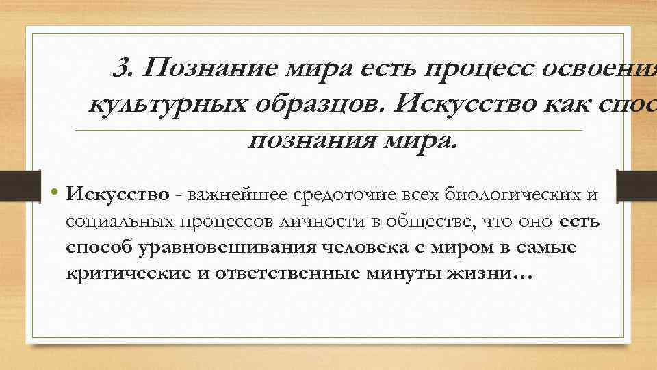 3. Познание мира есть процесс освоения культурных образцов. Искусство как спос познания мира. • Искусство - важнейшее средоточие всех биологических и социальных процессов личности в обществе, что оно есть способ уравновешивания человека с миром в самые критические и ответственные минуты жизни…