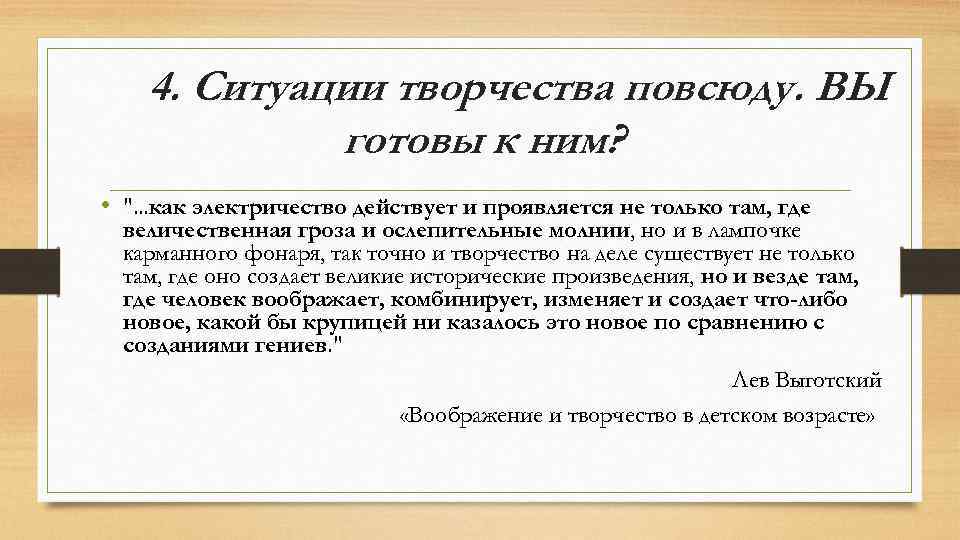 4. Ситуации творчества повсюду. ВЫ готовы к ним? • ". . . как электричество действует и проявляется не только там, где величественная гроза и ослепительные молнии, но и в лампочке карманного фонаря, так точно и творчество на деле существует не только там, где оно создает великие исторические произведения, но и везде там, где человек воображает, комбинирует, изменяет и создает что-либо новое, какой бы крупицей ни казалось это новое по сравнению с созданиями гениев. " Лев Выготский «Воображение и творчество в детском возрасте»