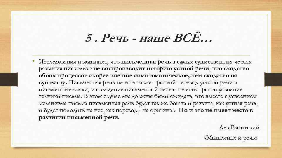5. Речь - наше ВСЁ… • Исследования показывает, что письменная речь в самых существенных чертах развития нисколько не воспроизводит историю устной речи, что сходство обоих процессов скорее внешне симптоматическое, чем сходство по существу. Письменная речь не есть также простой перевод устной речи в письменные знаки, и овладение письменной речью не есть просто усвоение техники письма. В этом случае мы должны были ожидать, что вместе с усвоением механизма письменная речь будет так же богата и развита, как устная речь, и будет походить на нее, как перевод - на оригинал. Но и это не имеет места в развитии письменной речи. Лев Выготский «Мышление и речь»