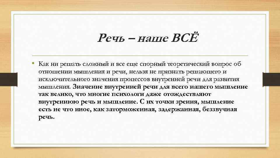 Речь – наше ВСЁ • Как ни решать сложный и все еще спорный теоретический вопрос об отношении мышления и речи, нельзя не признать решающего и исключительного значения процессов внутренней речи для развития мышления. Значение внутренней речи для всего нашего мышление так велико, что многие психологи даже отождествляют внутреннюю речь и мышление. С их точки зрения, мышление есть не что иное, как заторможенная, задержанная, беззвучная речь.