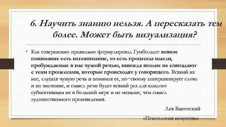 6. Научить знанию нельзя. А пересказать тем более. Может быть визуализация? • Как совершенно правильно формулировал Гумбольдт: всякое понимание есть непонимание, то есть процессы мысли, пробуждаемые в нас чужой речью, никогда вполне не совпадают с теми процессами, которые происходят у говорящего. Всякий из нас, слушая чужую речь и понимая ее, по‑своему апперципирует слова и их значение, и смысл речи будет всякий раз для каждого субъективным не в большей мере и не меньше, чем смысл художественного произведения. Лев Выготский «Психология искусства»