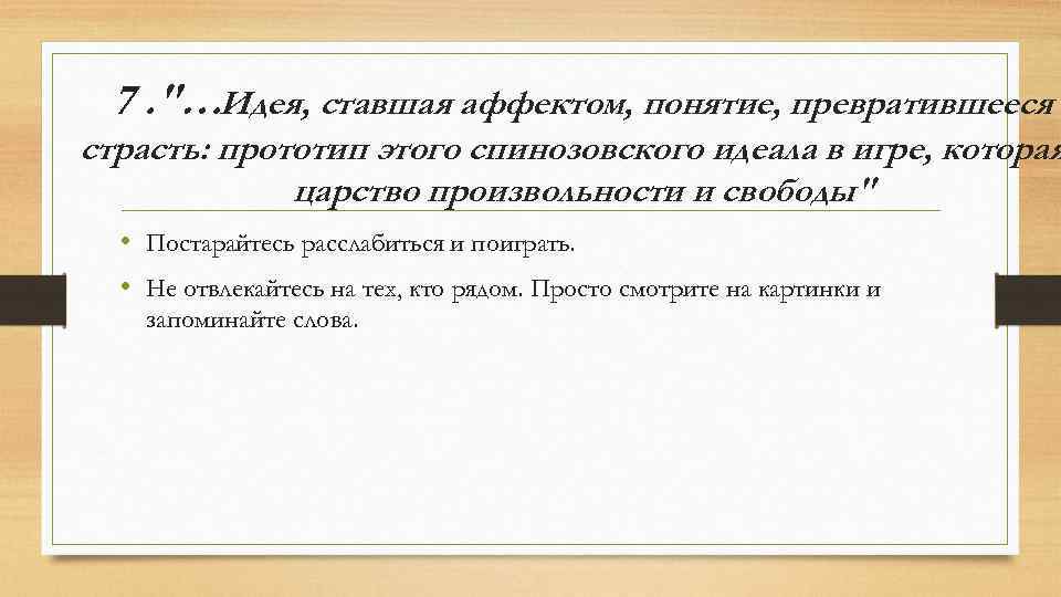 7. "…Идея, ставшая аффектом, понятие, превратившееся в страсть: прототип этого спинозовского идеала в игре, которая царство произвольности и свободы" • Постарайтесь расслабиться и поиграть. • Не отвлекайтесь на тех, кто рядом. Просто смотрите на картинки и запоминайте слова.
