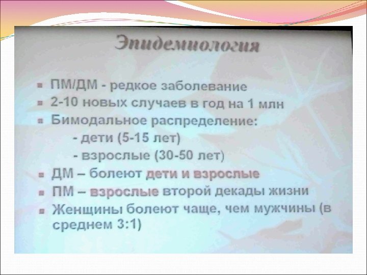 Этиология Этиологическим фактором ДМ ПМ может быть латентная инфекция пикарновирусами, некоторыми вирусами из группы Коксаки с внедрением возбудителя в геном мышечных клеток. Ассоциация ДМ ПМ с рядом опухолевых процессов, может свидетельствовать или в пользу вирусной этиологии этих опухолей, или являться демонстрацией антигенной мимикрии опухолевых структур и мышечной ткани. К заболеванию предрасположены лица, обладающие антигенами гистосовместимости HLA типа B 8 или DR 3.