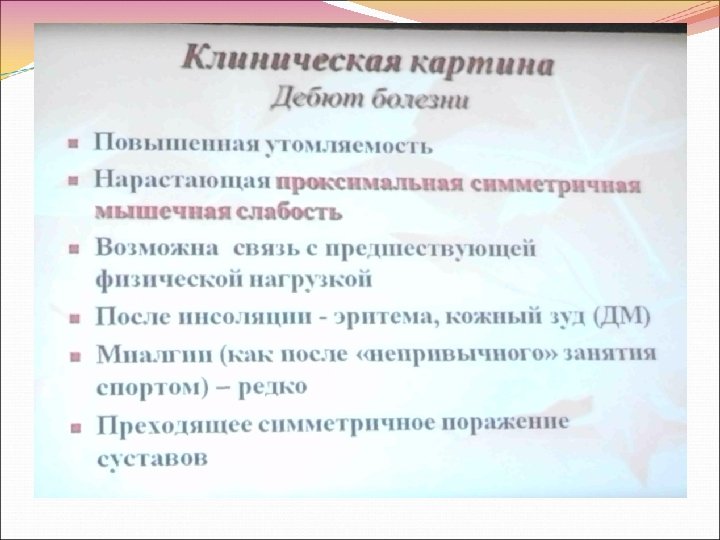 Международные критерии диагностики ДМ-ПМ (Tanimoto et al. , 1995). 1. Поражение кожи Гелиотропная (вызываемая солнечной инсоляцией) сыпь на лице в виде пурпурно красной сыпи на веках, периорбитальной эритемы в форме «очков» . Признак Готтрона – пурпурно красная шелушащаяся атрофическая эритема или такие же пятна на коже разгибательной поверхности суставов кистей рук. Эритема на коже разгибательной поверхности локтевых и коленных суставов. 2. Проксимальная мышечная слабость верхних и нижних конечностей. 3. Миалгии или боли в мышцах при пальпации. 4. Повышение активности КФК и / или альдолазы в сыворотке крови. 5. Миогенные изменения на электромиограмме: короткие, полифазные потенциалы моторных единиц со спонтанными потенциалами фибрилляции. 6. Выявление антител к Jo 1 (антитела к гистидил т. РНК синтетазе). 7. Недеструктивный артрит или артралгии. 8. Признаки системной воспалительной реакции: температура тела выше 370 С, положительный тест на СРП, увеличение СОЭ более 20 мм/час. 9. Характерные результаты морфологического исследования препаратов кожно мышечного лоскута, полученных до начала лечения больного глюкокортикоидами: миозит с потерей поперечной исчерченности, фрагментацией миофибрилл; базофилия саркоплазматического ретикулума миоцитов, очаги некроза, фиброза, регенерации миоцитов; лимфоидно плазмоцитарная инфильтрация мышечной ткани.