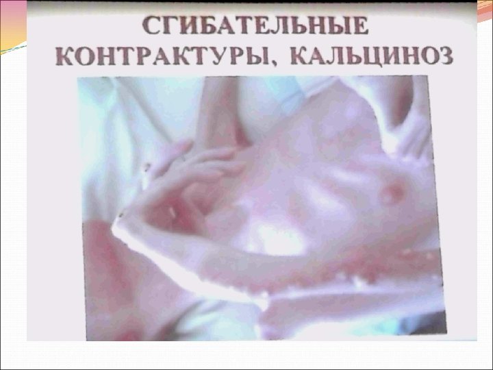 Суставная патология при ДМ ПМ ограничиваются артралгиями, скованностью, симптомами симметричного неэрозивного артрита мелких суставов кистей рук. Реже такой же артрит возникает в локтевых, плечевых, коленных, голеностопных суставах. Очаговый кальциноз обычно обнаруживается у молодых больных с ювенильной формой дерматополимиозита. Кальцификаты в виде плотных безболезненных узелков выявляются расположенными внутрикожно, подкожно на фасциальной поверхности и внутри пораженных мышц. Локальные отложения извести чаще возникают в мышцах плечевой, ягодичной областей, на голенях.