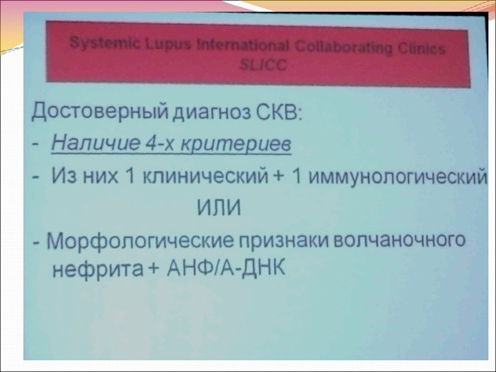 Диагностические критерии СКВ Американской ревматологической ассоциации (ACR, 1997): Диагноз считается достоверным, если имеют место 4 или критериев из перечисленных ниже. При наличии меньшего числа критериев диагноз считается предположительным (не исключается).