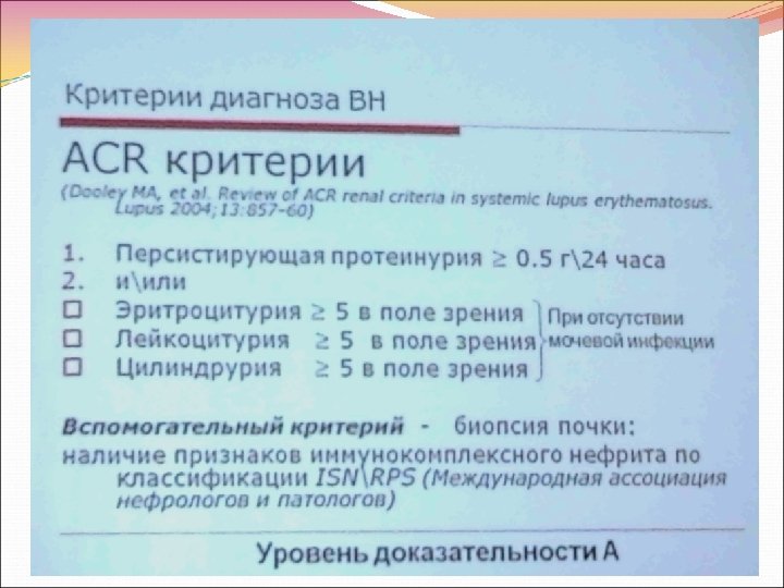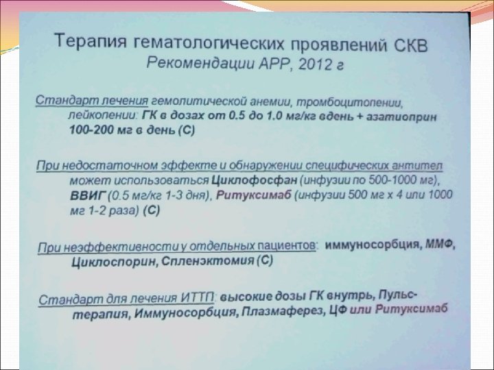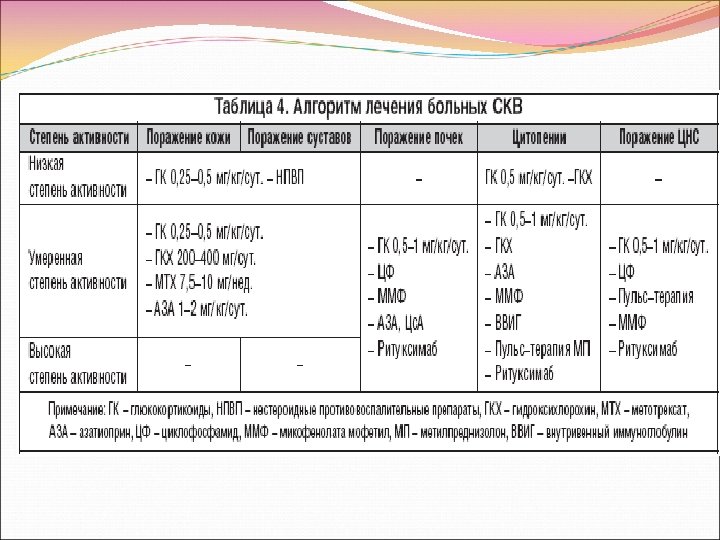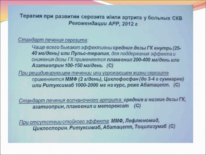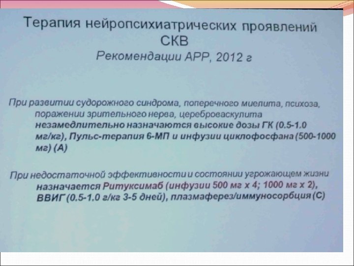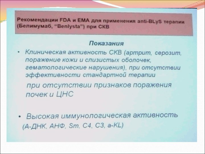У больных СКВ с высокой иммунологической активностью (высокий уровень анти –ДНК, снижение С 3 и С 4 компонентов комплемента), без клинических признаков поражения почек и ЦНС рекомендуется применение анти-BLy. S терапии (Бенлиста) по 10 мгкг ежемесячно (рекомендации FDA, 2011 г. ) Комментарий. Невысокая степень активности СКВ обычно наблюдается у больных без признаков поражения почек и ЦНС, в клинической картине СКВ преобладает поражение кожи, суставов, серозных оболочек, синдром Рейно, трофические нарушения. Рекомендуемая ежедневная доза ГК не должна превышать 20 -25 мг, плаквенил назначается в дозе 200 -400 мг в день (уровень доказательности С). Пульс-терапия (инфузии 6 метилпеднизолона 3 дня по 500 -1000 мг) назначается в случаях торпидного течения (уровень доказательности С).