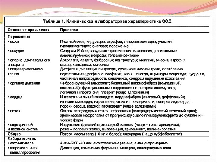 Клиническая картина Заболевание может протекать в острой, подострой, хронической формах. Острая форма диффузной СС характеризуется быстрым, в течение менее одного года развитием всех этапов поражения кожи. Одновременно появляются и достигают своего кульминационного развития поражения внутренних органов, в первую очередь почек, легких. В течение всего периода болезни выявляются максимальные отклонения показателей общего, биохимического анализов крови, демонстрирующих высокую активность патологического процесса.