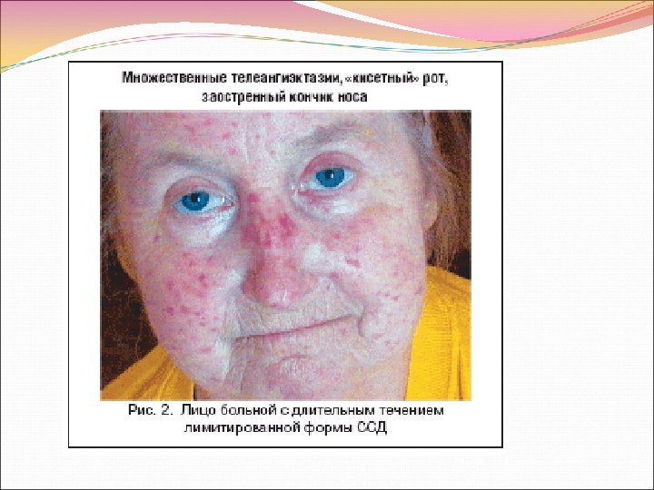 Ни с чем нельзя спутать очень характерное для СС поражение кожи лица. Лицо становится амимичным, маскообразным, неестественно блестящим, неравномерно пигментированным, часто с багровыми очагами телеангиоэктазий. Нос заостряется в виде птичьего клюва. Появляется «удивленный» взгляд, так как склеротическое стягивание кожи лба и щек широко раскрывает глазные щели, затрудняет моргание. Ротовая щель сужается. Кожа вокруг рта сжимается с формированием не расправляющихся радиальных складок, напоминая форму «кисета» .