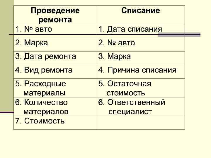 Концептуальный анализ n Автопарк, n Заявки, n Поставщики, n Обслуживание n Ремонт, n Специалисты n Поставки, n Возврат n Списание n Состояние авто n Расход n Расчет. материалов, n Клиенты,