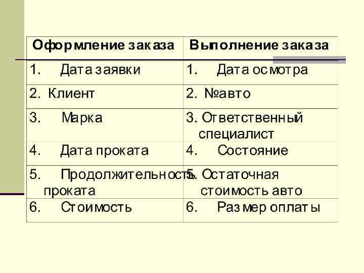 14. Заявки 1. № заявки 2. Дата заявки 3. Код клиента 4. Код модели авто 5. Дата начала проката 7. Продолжительность проката 8. Стоимость