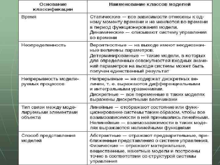 Графическая модель –объект, геометрически подобный оригиналу (географическая карта). Геометрическая модель –объект, подобный оригиналу по форме (слепок). Функциональная модель –объект, отображающий поведение оригинала (любая действующая модель). Символическая модель –выражается с помощью абстрактных символов (программа для ЭВМ). Статистическая модель –описывает взаимосвязи между элементами, имеющие случайный характер (схема Бернулли). Описательная (дескриптивная) модель –словесное описание, сравнительные характеристики (различные определения). Математическая модель –совокупность
