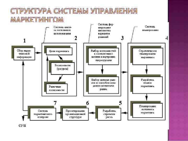 Систему управления маркетингом: (1 -3) - процедуры маркетинговых исследований, предшествуют разработке плана маркетинга (4) - иерархическая процедура планирования маркетинга (5 -6) - подготовительные процедуры к реализации планов маркетинга (7 )- контроль разработки планов маркетинга и их исполнение Каждая из процедур завершается принятием решений, используемых для реализации последующей процедуры.
