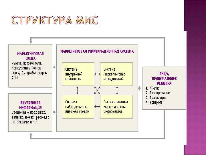 Функции МИС в структуре предприятия могут быть представлены в виде маркетинговой системы поддержки принятия решений (MDSS — marketing decision support system), которая является начальным и конечным элементом информационных процессов. Выделяют четыре основных блока в структуре МИС: подсистема внутренней отчетности подсистема маркетингового наблюдения подсистема маркетингового анализа подсистема маркетинговых исследований