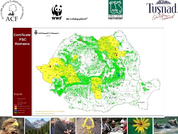 Atribuţii FSC (Forest Stewardship Council) • Dezvoltarea de Standarde • Acreditarea de Organisme de Certificare (24) şi Iniţiative Naţionale (53) şi Standarde Naţionale prin intermediul FSC Programul de Acreditare Lista cu organismele de certificare acreditate de către FSC se găseşte la www. fsc. org sau www. certificareforestiera. ro • Etichetarea produselor din lemn
