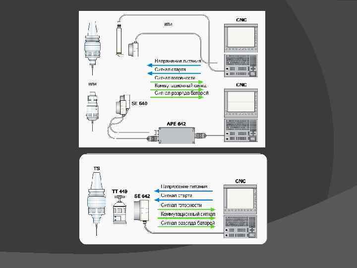 TS 44 x, TS 64 x, TS 740 Измерительные щупы с инфракрасной передачей сигналов Измерительные щупы TS 44 x, TS 64 x и TS 740 передают коммутационный сигнал через ИК-порт. Поэтому они хорошо подходят для использования на станках с автоматической сменой инструмента. Инфракрасный канал Инфракрасная передача сигнала осуществляется между щупом приемопередатчиком SE. Предлагаются следующие типы приемопередатчиков: SE 640 для монтажа в рабочем пространстве станка SE 642 общий приемопередатчик SE для измерительных щупов для заготовки и инструмента. Они подходят к любому из щупов TS 44 x, TS 64 x, TS 740. Инфракрасное излучение невосприимчиво к помехам и работает даже при отражении. Благодаря этому у него очень широкая область применения, например, TS 64 x можно использовать с вертикальным и горизонтальным шпинделем, а также с поворотной головкой. Если области распространения ИК-излучения все таки недостаточно, то можно использовать два SE 640, подключив их через блок согласования APE 642 / По инфракрасному каналу передается несколько сигналов; измерительный щуп активируется сигналом старта. Ответный сигнал готовности говорит о готовности щупа к работе. При отклонение измерительного стержня генерируется коммутационный сигнал. Если заряд батарей в TS 64 x/TS 740 падает до уровня менее 10%, то передается сигнал разряда батарей. При падении уровня стартового сигнала измерительный щуп выключается.