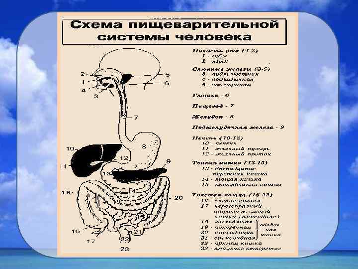 Пищеварительная система человека состоит из: • • ротовая полость глотка пищевод желудок тонкий кишечник толстый кишечник С пищеварительным трактом протоками связаны большие пищеварительные железы: слюнные, печень и поджелудочная железа. Длина пищеварительного тракта человека составляет 8 -10 метров .