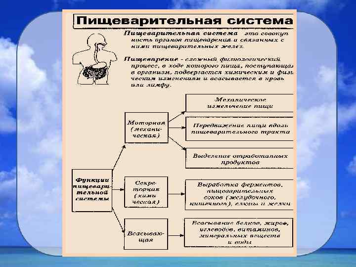 Функции пищеварения • • • Это сложный физиологический процесс механической и химической обработки пищи, всасывания питательных веществ, выделения не переварившихся остатков пищи. Пищеварительная система - функции: секреторная, моторная, всасывательная, выделительная. Секреторная функция - выработка пищеварительных соков железистыми клетками, входящими в состав пищеварительных желез. Моторная функция - сокращение мышц, входящих в состав стенок пищеварительного тракта и механическое измельчение пищи, ее перемешивание и продвижение по пищеварительному тракту. Всасывательная функция – поступление продуктов ферментативного расщепления (питательных веществ) в кровь и лимфу через стенку отделов пищеварительной системы. Выделительная функция - выведение из пищеварительного тракта не переварившихся веществ, и некоторых продуктов обмена. Пищеварительные соки обеспечивают увлажнение, разжижение пищи, создают определенную среду (р. Н) и содержат воду, слизь, пищеварительные ферменты, биологически активные вещества, минеральные соли и др. Под действием пищеварительных ферментов сложные полимерные молекулы пищевых веществ расщепляются до более простых, которые могут всасываться в кровь и лимфу и усваиваться клетками.