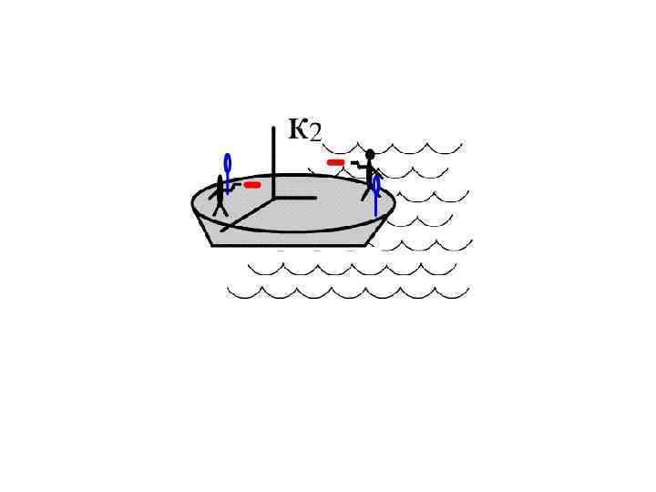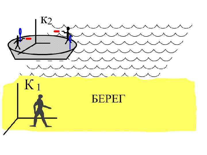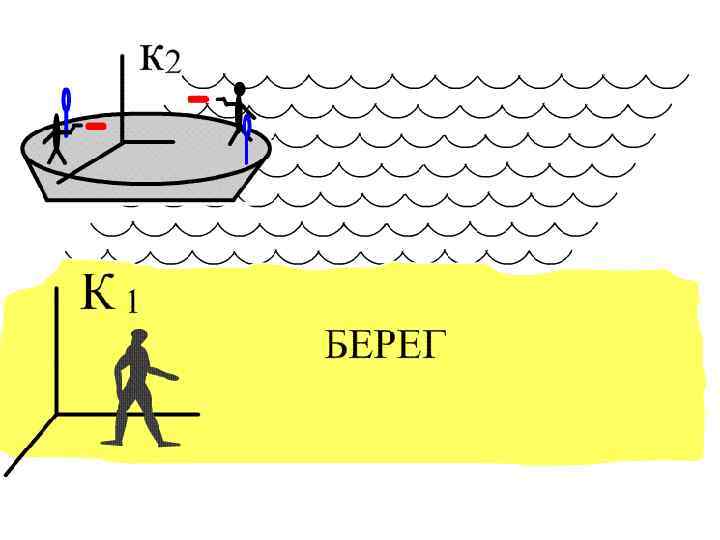В системе координат К 1, связанной с берегом человек на корабле движется со скоростью корабля. В системе координат К 2, связанной с кораблем, человек находится в состоянии покоя