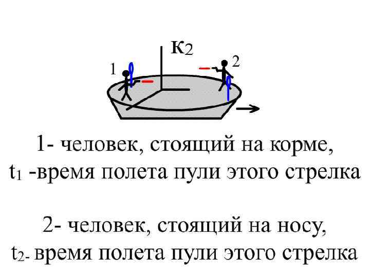 В системе координат К 2, связаной с кораблем, оба стрелка по прежнему находятся в состоянии покоя. Однако поражение мишеней происходит в различные моменты времени, поскольку эта система координат перестала быть инерциальной
