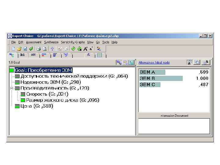 Expert Choice позволяет сравнивать неограниченное количество факторов, которые необходимо учесть при выборе решения. При этом компьютер довольствуется даже неформализованной информацией. Проанализировав и сопоставив все заложенные сведения, компьютер выдает рейтинг решений, первое в котором является наилучшим.