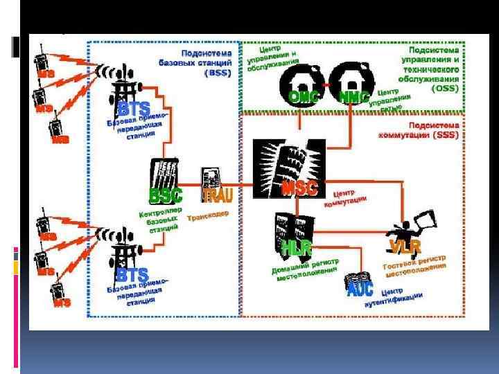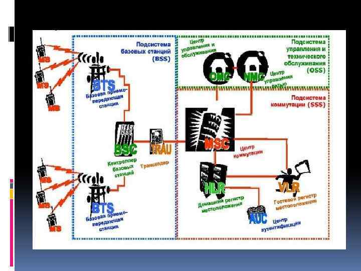 Структура NSS (SSS) MSC ( Mobile Switching Center) – центр коммутации HLR (Home Location Register) – домашний регистр местоположения VLR (Visitor Location Register) – гостевой регистр местоположения Au. C (Authentication Center) – центр аутентификации