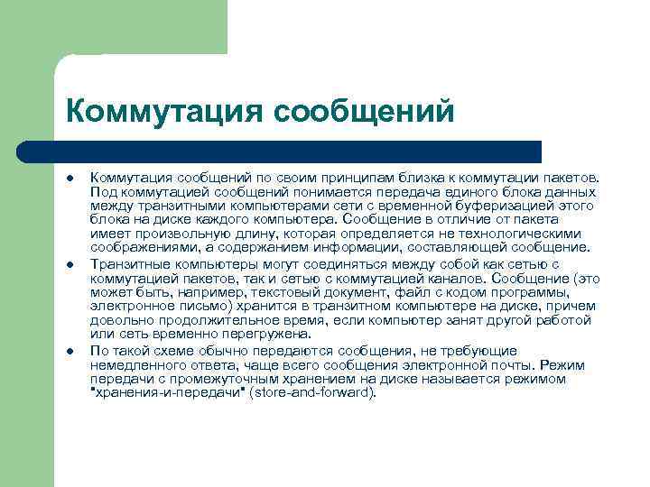 Коммутация сообщений l Коммутация сообщений по своим принципам близка к коммутации пакетов. Под коммутацией сообщений понимается передача единого блока данных между транзитными компьютерами сети с временной буферизацией этого блока на диске каждого компьютера. Сообщение в отличие от пакета имеет произвольную длину, которая определяется не технологическими соображениями, а содержанием информации, составляющей сообщение. l Транзитные компьютеры могут соединяться между собой как сетью с коммутацией пакетов, так и сетью с коммутацией каналов. Сообщение (это может быть, например, текстовый документ, файл с кодом программы, электронное письмо) хранится в транзитном компьютере на диске, причем довольно продолжительное время, если компьютер занят другой работой или сеть временно перегружена. l По такой схеме обычно передаются сообщения, не требующие немедленного ответа, чаще всего сообщения электронной почты. Режим передачи с промежуточным хранением на диске называется режимом "хранения-и-передачи" (store-and-forward).