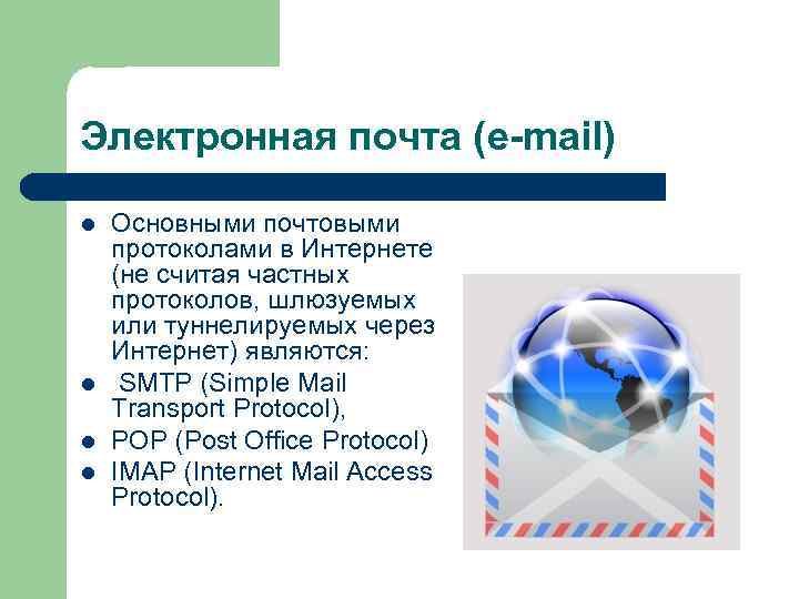 Электронная почта (e-mail) l Основными почтовыми протоколами в Интернете (не считая частных протоколов, шлюзуемых или туннелируемых через Интернет) являются: l SMTP (Simple Mail Transport Protocol), l POP (Post Office Protocol) l IMAP (Internet Mail Access Protocol).