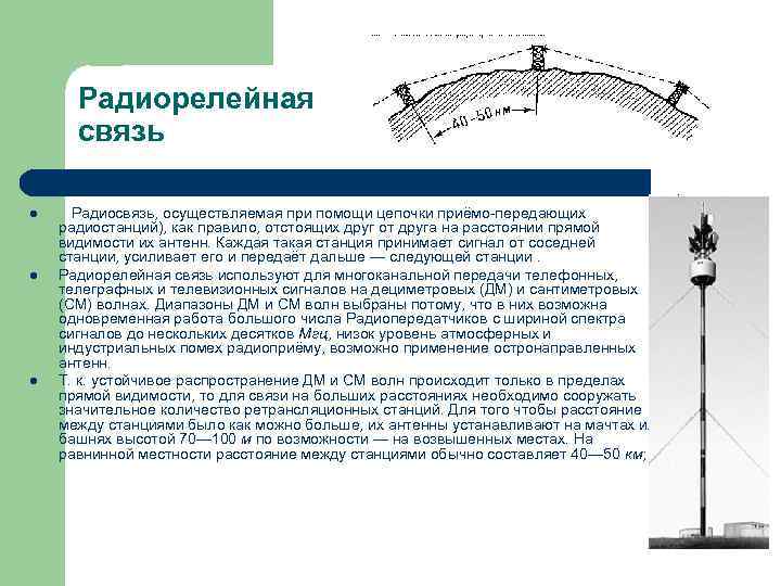 Радиорелейная связь l Радиосвязь, осуществляемая при помощи цепочки приёмо-передающих радиостанций), как правило, отстоящих друг от друга на расстоянии прямой видимости их антенн. Каждая такая станция принимает сигнал от соседней станции, усиливает его и передаёт дальше — следующей станции. l Радиорелейная связь используют для многоканальной передачи телефонных, телеграфных и телевизионных сигналов на дециметровых (ДМ) и сантиметровых (СМ) волнах. Диапазоны ДМ и СМ волн выбраны потому, что в них возможна одновременная работа большого числа Радиопередатчиков с шириной спектра сигналов до нескольких десятков Мгц, низок уровень атмосферных и индустриальных помех радиоприёму, возможно применение остронаправленных антенн. l Т. к. устойчивое распространение ДМ и СМ волн происходит только в пределах прямой видимости, то для связи на больших расстояниях необходимо сооружать значительное количество ретрансляционных станций. Для того чтобы расстояние между станциями было как можно больше, их антенны устанавливают на мачтах или башнях высотой 70— 100 м по возможности — на возвышенных местах. На равнинной местности расстояние между станциями обычно составляет 40— 50 км;