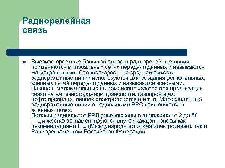 Радиорелейная связь l Высокоскоростные большой емкости радиорелейные линии применяются в глобальных сетях передачи данных и называются магистральными. Среднескоростные средней емкости радиорелейные линии используются для создания региональных, зоновых сетей передачи данных и называются зоновыми. Наконец, малоканальные широко используются для организации связи на железнодорожном транспорте, газопроводах, нефтепроводах, линиях электропередачи и т. п. Малоканальные радиорелейные линии с подвижными РРС применяются в военных целях. Полосы радиочастот РРЛ расположены в диапазоне от 2 до 50 ГГц и жестко регламентируются внутри каждой полосы как рекомендациями ITU (Международного союза электросвязи), так и Радиорегламентом Российской Федерации.