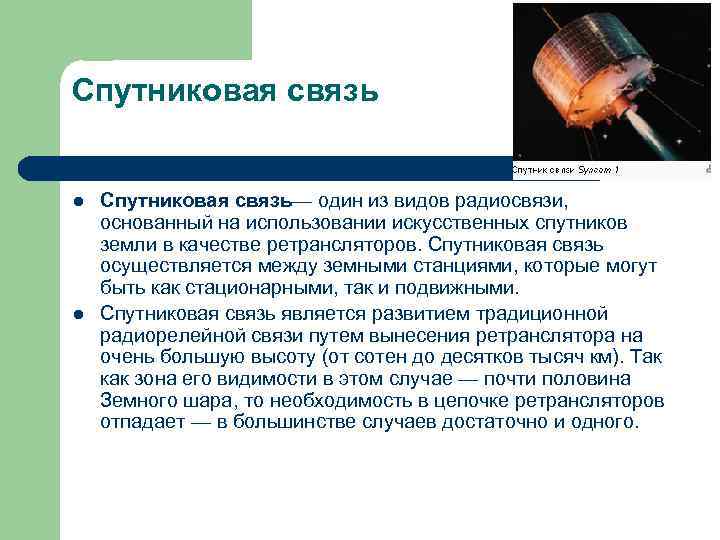 Спутниковая связь l Спутниковая связь— один из видов радиосвязи, основанный на использовании искусственных спутников земли в качестве ретрансляторов. Спутниковая связь осуществляется между земными станциями, которые могут быть как стационарными, так и подвижными. l Спутниковая связь является развитием традиционной радиорелейной связи путем вынесения ретранслятора на очень большую высоту (от сотен до десятков тысяч км). Так как зона его видимости в этом случае — почти половина Земного шара, то необходимость в цепочке ретрансляторов отпадает — в большинстве случаев достаточно и одного.