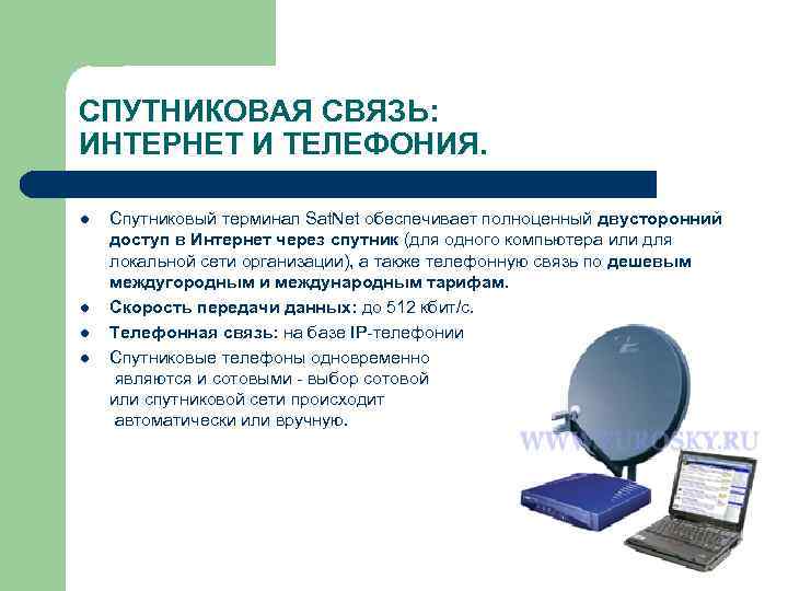 СПУТНИКОВАЯ СВЯЗЬ: ИНТЕРНЕТ И ТЕЛЕФОНИЯ. l Спутниковый терминал Sat. Net обеспечивает полноценный двусторонний доступ в Интернет через спутник (для одного компьютера или для локальной сети организации), а также телефонную связь по дешевым междугородным и международным тарифам. l Скорость передачи данных: до 512 кбит/с. l Телефонная связь: на базе IP-телефонии l Спутниковые телефоны одновременно являются и сотовыми - выбор сотовой или спутниковой сети происходит автоматически или вручную.