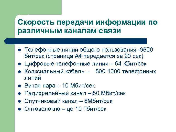Скорость передачи информации по различным каналам связи l Телефонные линии общего пользования -9600 бит/сек (страница А 4 передается за 20 сек) l Цифровые телефонные линии – 64 Кбит/сек l Коаксиальный кабель – 500 -1000 телефонных линий l Витая пара – 10 Мбит/сек l Радиорелейный канал – 50 Мбит/сек l Спутниковый канал – 8 Мбит/сек l Оптоволокно – до 10 Гбит/сек