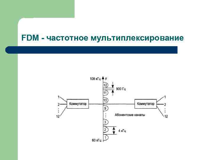 FDM - частотное мультиплексирование На вход FDM коммутатора поступают входные сигналы от абонентов телефонной сети Коммутатор выполняет перенос частоты выделенного канала в выделенный каналу диапазон Чтобы низкочастотные составляющие сигналов разных каналов не смешивались между собой, полосы делают шириной в 4 кгц, а не в 3, 1 кгц, оставляя между ними страховый промежуток в 900 гц. В канале между двумя FDM коммутаторами одновременно передаются сигналы всех абонентских каналов, но каждый из них свою полосу частот