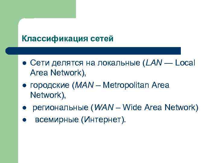 Классификация сетей l Сети делятся на локальные (LAN — Local Area Network), l городские (MAN – Metropolitan Area Network), l региональные (WAN – Wide Area Network) l всемирные (Интернет).