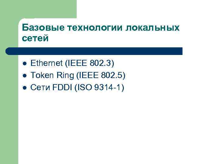 Базовые технологии локальных сетей l Ethernet (IEEE 802. 3) l Token Ring (IEEE 802. 5) l Сети FDDI (ISO 9314 -1)