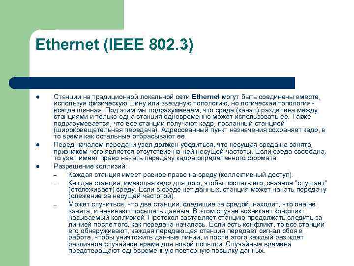 Ethernet (IEEE 802. 3) l Станции на традиционной локальной сети Ethernet могут быть соединены вместе, используя физическую шину или звездную топологию, но логическая топология - всегда шинная. Под этим мы подразумеваем, что среда (канал) разделена между станциями и только одна станция одновременно может использовать ее. Также подразумевается, что все станции получают кадр, посланный станцией (широковещательная передача). Адресованный пункт назначения сохраняет кадр, в то время как остальные отбрасывают ее. l Перед началом передачи узел должен убедиться, что несущая среда не занята, признаком чего является отсутствие на ней несущей частоты. Если среда свободна, то узел имеет право начать передачу кадра определенного формата. l Разрешение коллизий: – Каждая станция имеет равное право на среду (коллективный доступ). – Каждая станция, имеющая кадр для того, чтобы послать его, сначала "слушает" (отслеживает) среду. Если в среде нет данных, станция может начать передачу (слежение за несущей частотой). – Может случиться, что две станции, следящие за средой, находят, что она не занята, и начинают посылать данные. В этом случае возникает конфликт, называемый коллизией. Протокол заставляет станцию продолжать следить за линией после того, как передача началась. Если есть конфликт, то все станции его обнаруживают, каждая передающая станция передает сигнал сбоя в работе, чтобы уничтожить данные линии, и после этого каждый раз ждет различное случайное время для новой попытки. Случайные времена предотвращают одновременную повторную посылку данных.