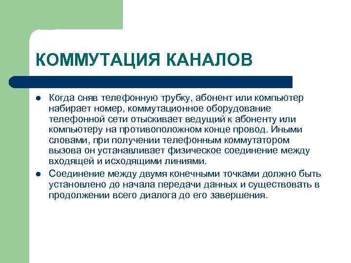 КОММУТАЦИЯ КАНАЛОВ l Когда сняв телефонную трубку, абонент или компьютер набирает номер, коммутационное оборудование телефонной сети отыскивает ведущий к абоненту или компьютеру на противоположном конце провод. Иными словами, при получении телефонным коммутатором вызова он устанавливает физическое соединение между входящей и исходящими линиями. l Соединение между двумя конечными точками должно быть установлено до начала передачи данных и существовать в продолжении всего диалога до его завершения.