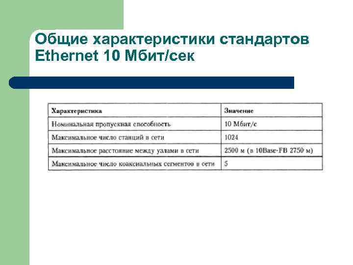 Общие характеристики стандартов Ethernet 10 Мбит/сек