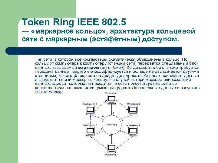 Token Ring IEEE 802. 5 — «маркерное кольцо» , архитектура кольцевой сети с маркерным (эстафетным) доступом. Тип сети, в которой все компьютеры схематически объединены в кольцо. По кольцу от компьютера к компьютеру (станции сети) передается специальный блок данных, называемый маркером (англ. token). Когда какой-либо станции требуется передача данных, маркер ею модифицируется и больше не распознается другими станциями, как спецблок, пока не дойдёт до адресата. Адресат принимает данные и запускает новый маркер по кольцу. На случай потери маркера или хождения данных, адресат которых не находится, в сети присутствует машина со специальными полномочиями, умеющая удалять безадресные данные и запускать новый маркер.