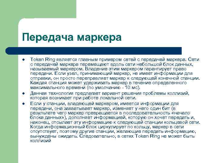Передача маркера l Token Ring является главным примером сетей с передачей маркера. Сети с передачей маркера перемещают вдоль сети небольшой блок данных, называемый маркером. Владение этим маркером гарантирует право передачи. Если узел, принимающий маркер, не имеет информации для отправки, он просто переправляет маркер к следующей конечной станции. Каждая станция может удерживать маркер в течение определенного максимального времени (по умолчанию - 10 мс). l Данная технология предлагает вариант решения проблемы коллизий, которая возникает при работе локальной сети. l Если у станции, владеющей маркером, имеется информации для передачи, она захватывает маркер, изменяет у него один бит (в результате чего маркер превращается в последовательность «начало блока данных» ), дополняет информацией, которую он хочет передать и, наконец, отсылает эту информацию к следующей станции кольцевой сети. Когда информационный блок циркулирует по кольцу, маркер в сети отсутствует, поэтому другие станции, желающие передать информацию, вынуждены ожидать. Следовательно, в сетях Token Ring не может быть коллизий