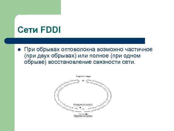 Сети FDDI l При обрывах оптоволокна возможно частичное (при двух обрывах) или полное (при одном обрыве) восстановление связности сети.