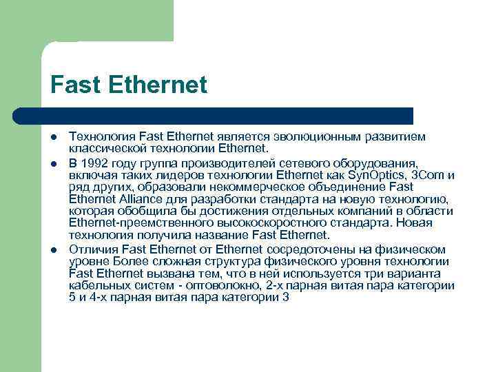 Fast Ethernet l Технология Fast Ethernet является эволюционным развитием классической технологии Ethernet. l В 1992 году группа производителей сетевого оборудования, включая таких лидеров технологии Ethernet как Syn. Optics, 3 Com и ряд других, образовали некоммерческое объединение Fast Ethernet Alliance для разработки стандарта на новую технологию, которая обобщила бы достижения отдельных компаний в области Ethernet-преемственного высокоскоростного стандарта. Новая технология получила название Fast Ethernet. l Отличия Fast Ethernet от Ethernet сосредоточены на физическом уровне Более сложная структура физического уровня технологии Fast Ethernet вызвана тем, что в ней используется три варианта кабельных систем - оптоволокно, 2 -х парная витая пара категории 5 и 4 -х парная витая пара категории 3