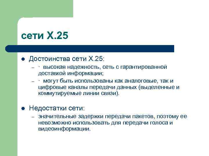 сети Х. 25 l Достоинства сети Х. 25: – · высокая надежность, сеть с гарантированной доставкой информации; – · могут быть использованы как аналоговые, так и цифровые каналы передачи данных (выделенные и коммутируемые линии связи). l Недостатки сети: – значительные задержки передачи пакетов, поэтому ее невозможно использовать для передачи голоса и видеоинформации.