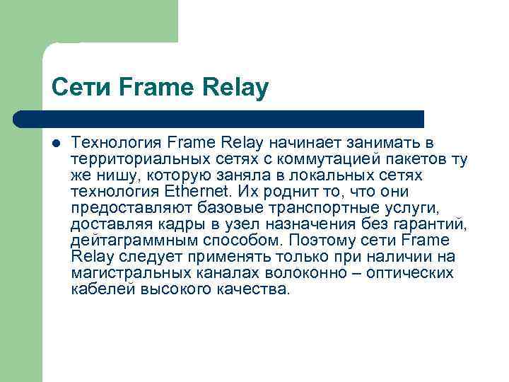 Сети Frame Relay l Технология Frame Relay начинает занимать в территориальных сетях с коммутацией пакетов ту же нишу, которую заняла в локальных сетях технология Ethernet. Их роднит то, что они предоставляют базовые транспортные услуги, доставляя кадры в узел назначения без гарантий, дейтаграммным способом. Поэтому сети Frame Relay следует применять только при наличии на магистральных каналах волоконно – оптических кабелей высокого качества.
