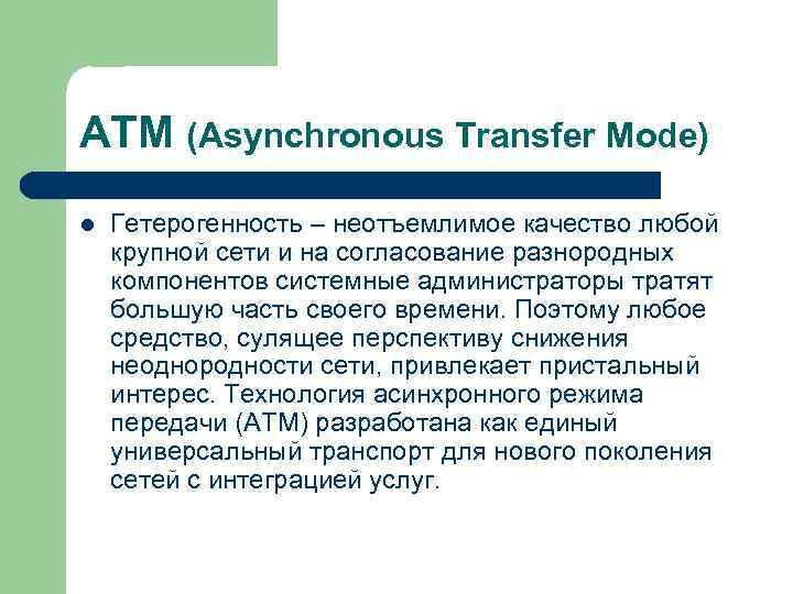 ATM (Asynchronous Transfer Mode) l Гетерогенность – неотъемлимое качество любой крупной сети и на согласование разнородных компонентов системные администраторы тратят большую часть своего времени. Поэтому любое средство, сулящее перспективу снижения неоднородности сети, привлекает пристальный интерес. Технология асинхронного режима передачи (АТМ) разработана как единый универсальный транспорт для нового поколения сетей с интеграцией услуг.