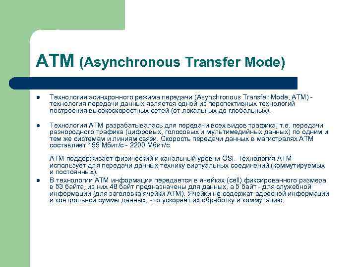 ATM (Asynchronous Transfer Mode) l Технология асинхронного режима передачи (Asynchronous Transfer Mode, ATM) - технология передачи данных является одной из перспективных технологий построения высокоскоростных сетей (от локальных до глобальных). l Технология ATM разрабатывалась для передачи всех видов трафика, т. е. передачи разнородного трафика (цифровых, голосовых и мультимедийных данных) по одним и тем же системам и линиям связи. Скорость передачи данных в магистралях ATM составляет 155 Мбит/с - 2200 Мбит/с. ATM поддерживает физический и канальный уровни OSI. Технология ATM использует для передачи данных технику виртуальных соединений (коммутируемых и постоянных). l В технологии ATM информация передается в ячейках (cell) фиксированного размера в 53 байта, из них 48 байт предназначены для данных, а 5 байт - для служебной информации (для заголовка ячейки ATM). Ячейки не содержат адресной информации и контрольной суммы данных, что ускоряет их обработку и коммутацию.