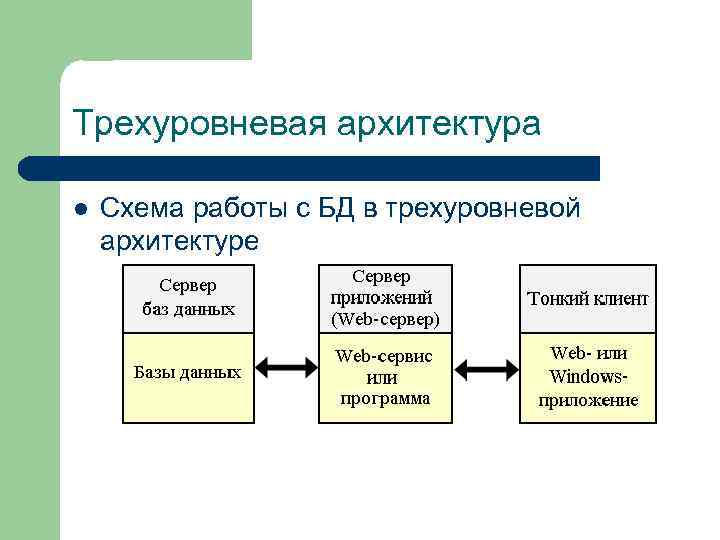 Трехуровневая архитектура l Схема работы с БД в трехуровневой архитектуре